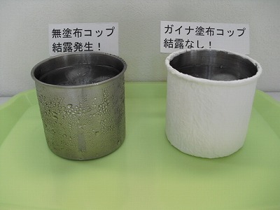 左の未塗布コップは、結露が発生しますが、右のガイナ塗布コップは、結露が発生しません。